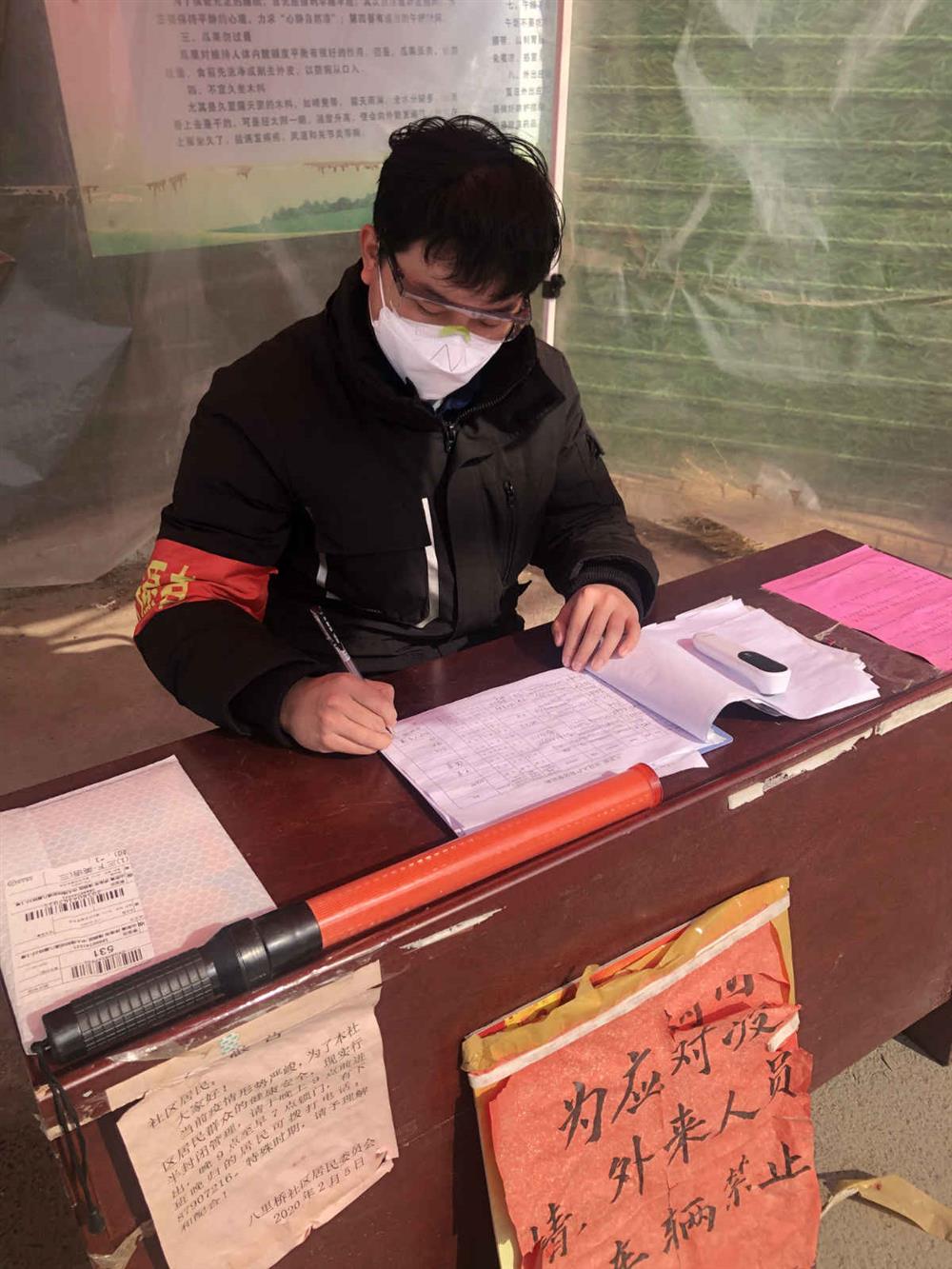 根据居委会安排,柴楠每天在社区出入口进行询问登记、测量体温、疫情宣传、人员排查等工作。2020年的第一场春雨给疫情防控工作带来了更大的难题,他身披雨衣,在刺骨的寒风和冰冷的细雨中一丝不苟的测体温、查验身份证、做好信息登记…一忙就是整整一天。