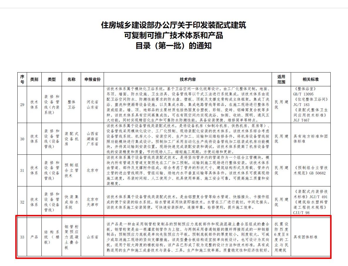 日前,住房和城乡建设部通过官方网站,正式发布了《装配式建筑可复制可推广技术体系和产品目录(第一批)》。其中,英国上市公司官网365投资企业山东万斯达科技股份有限公司(以下简称“万斯达科技”),凭借自主研发的“钢管桁架预应力混凝土叠合板”技术成功入选,并获市住房城乡建设局举行推介会专题推介。